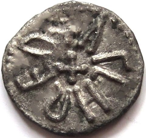 S67 ECLECTIC [c. 710-60] silver sceat Saltire standard - type 70 obv. saltire in beaded standard; rev. beaded standard with annulet enclosing pellet' 1.09 g S 833b [£225 in VF]; Abramson SL: 13-190 [this coin illustrated]; SCBI 69: 740 [this coin illustrated]. Found: Foxton, 2008. Recorded: EMC 2008.0161. RARE VF+ £198